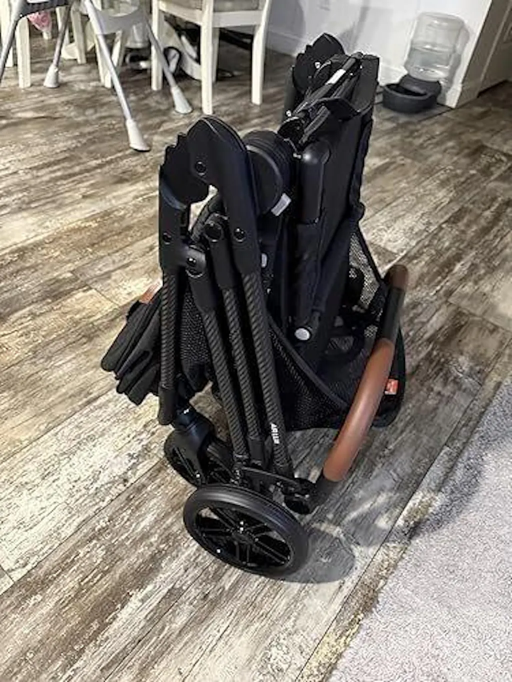 -when using the car seat and not the included seat, the stroller has no carry handle when folded. It can be carried by the leather push handle if you flip it around but I wish it had a bar or strap through the center to carry without flipping it