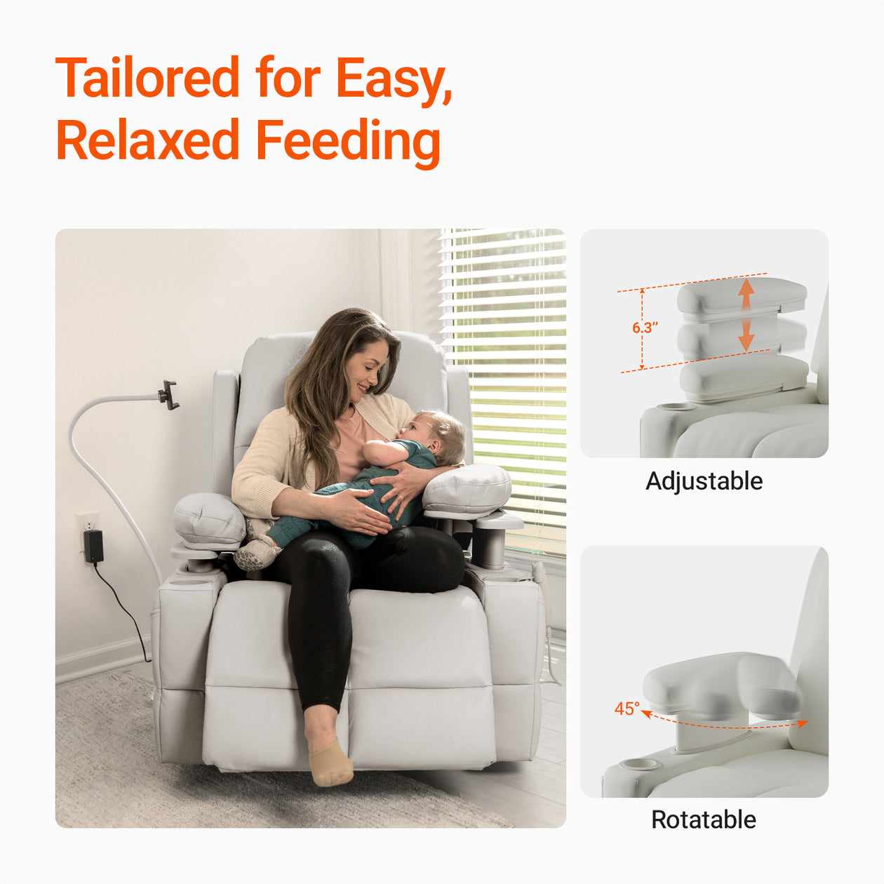 Adjustable, rotatable armrests for comfortble breastfeeding support.