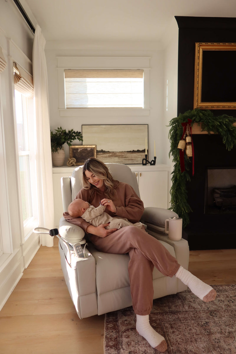 I love how the arms of the chair adjust to help with holding baby comfortably, and being able to rock is perfect to put the little one to sleep.