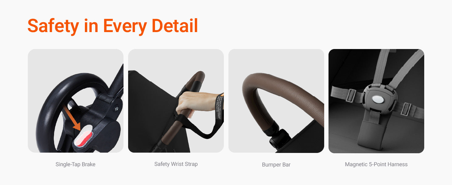 Safety is a priority for the MAMAZING Ultra Airstroller. It includes a 5-point harness, a foot-operated brake, and OEKO-TEX certified fabric for a secure and non-toxic environment. Thefoldable pushchairmeets or exceeds CPSC and ASTM safety standards, ensuring peace of mind for parents using thiscompact travel stroller.