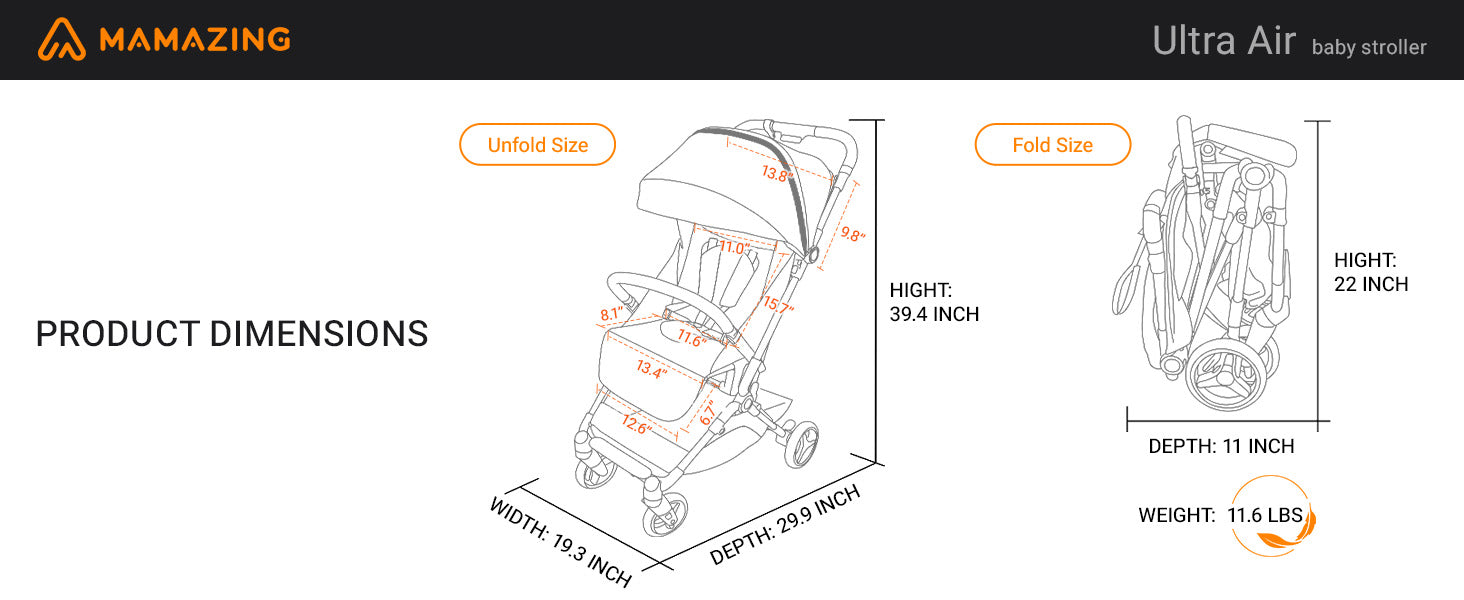The MAMAZING Ultra Air is designed as acompact travel strollerthat prioritizes portability and ease. Weighing only 11.5 lbs with a carbon fiber frame, thisfoldable strollerfolds in seconds with a one-handed mechanism, making it an idealairplane stroller. Its compact size (comparable to a 21-inch carry-on) fits in overhead bins or car trunks, perfect for travel or daily errands.
